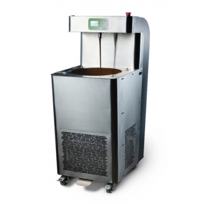 | Подключение дополнительных устройств: Вибростолик, стол для глазирования, дозировачная насадка (Camlock). | Водяное охлаждение — «Водяная рубашка», в которую одет узел со шнеком, является более эффективным способом охлаждения в темперирующих машинах, чем охлаждение трубками. Всё потому, что площадь соприкосновения трубы (в которой находится шнек) с рубашкой ощутимо больше, чем с медными трубками. |